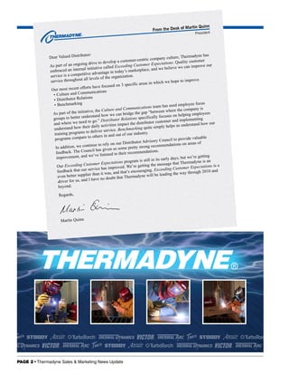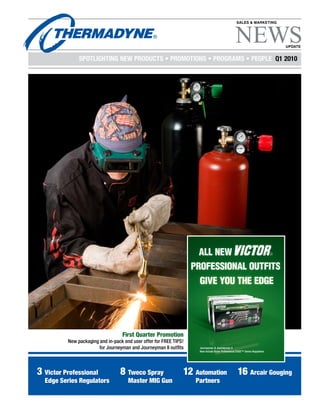 This document is a newsletter from Thermadyne updating distributors on new products, promotions, and company initiatives for the first quarter of 2010. It highlights the new Victor Professional Edge Series regulators which include built-in gauges and user-friendly design. It also discusses Thermadyne's focus on exceeding customer expectations through initiatives to improve culture, communications, and benchmarking against other companies. The president notes feedback that Thermadyne's service is improving and expects the company to continue leading in customer service through 2010.