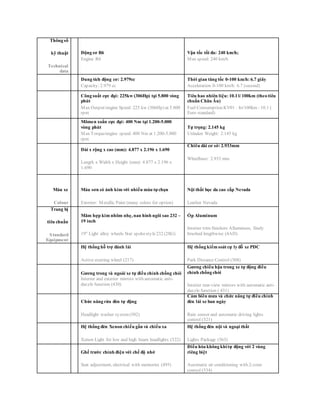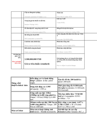 Tài liệu cung cấp thông số kỹ thuật chi tiết của hai mẫu động cơ khác nhau, trong đó động cơ R6 có công suất cực đại 306 hp và vận tốc tối đa 240 km/h, trong khi động cơ 4 xi lanh cho công suất 150 hp và vận tốc tối đa 200 km/h. Cả hai mẫu xe đều được trang bị nhiều tính năng hiện đại và tiêu chuẩn tiện nghi cao cấp. Giá bán cho mẫu xe BMW X6 là 1.845.000.000 VND và giá cho động cơ R6 là 3.388.000.000 VND, đều đã bao gồm VAT 10%.