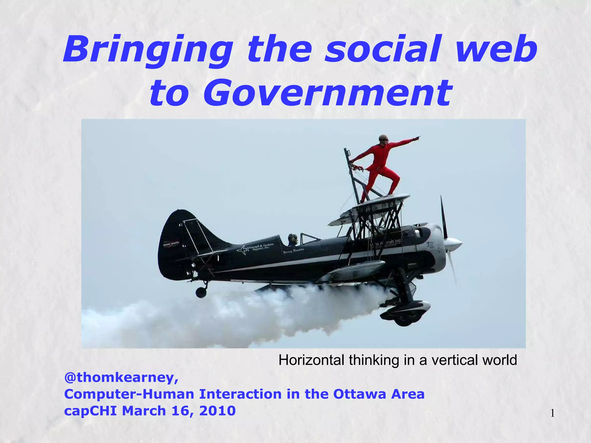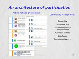 The document discusses the evolution and implementation of collaborative platforms within the Canadian government, initiated in October 2007 to enhance communication, sharing, and efficiency among public servants. It highlights the launch of tools like GCPEDIA, GCConnex, and GCInnovation, aiming to foster innovation, transparency, and collective action while addressing challenges such as existing procurement processes and trust issues. Ultimately, it emphasizes the importance of community management and adaptive learning for successful integration of these tools into the public service framework.