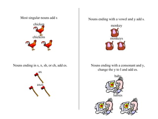 This document discusses plural nouns and possessive nouns. It explains that most singular nouns form their plural by adding 's', but there are exceptions for nouns ending in certain letters like 'x', 'ch', 's', and 'y'. It also describes how to make singular and plural nouns possessive by adding apostrophes with or without 's'.