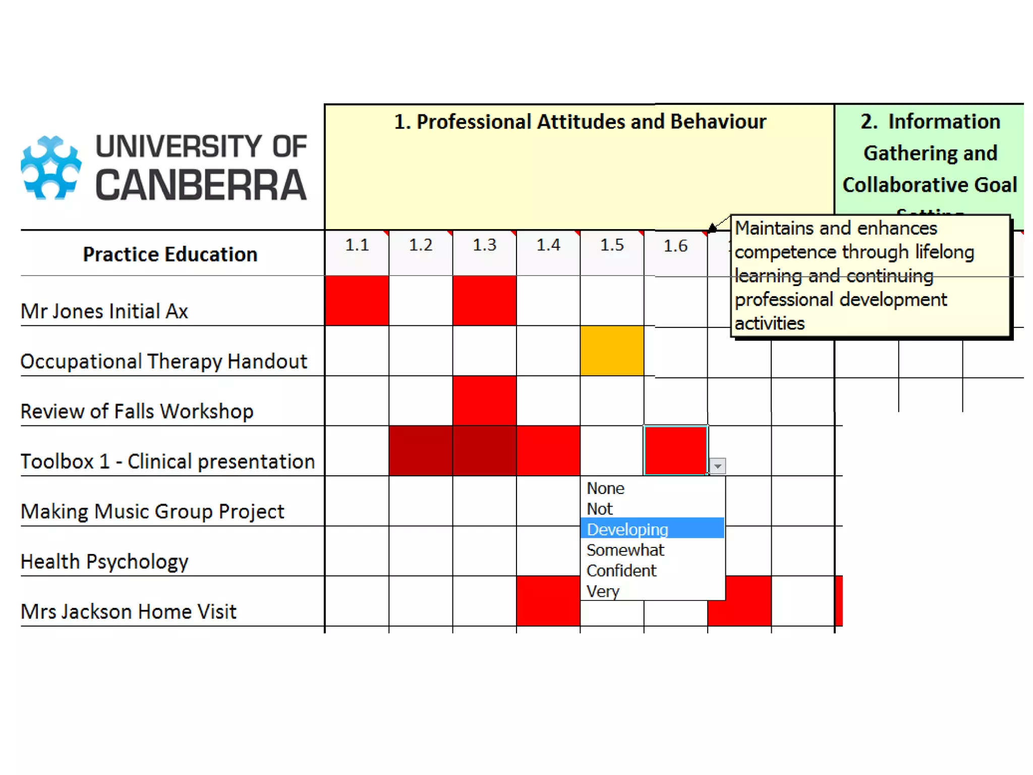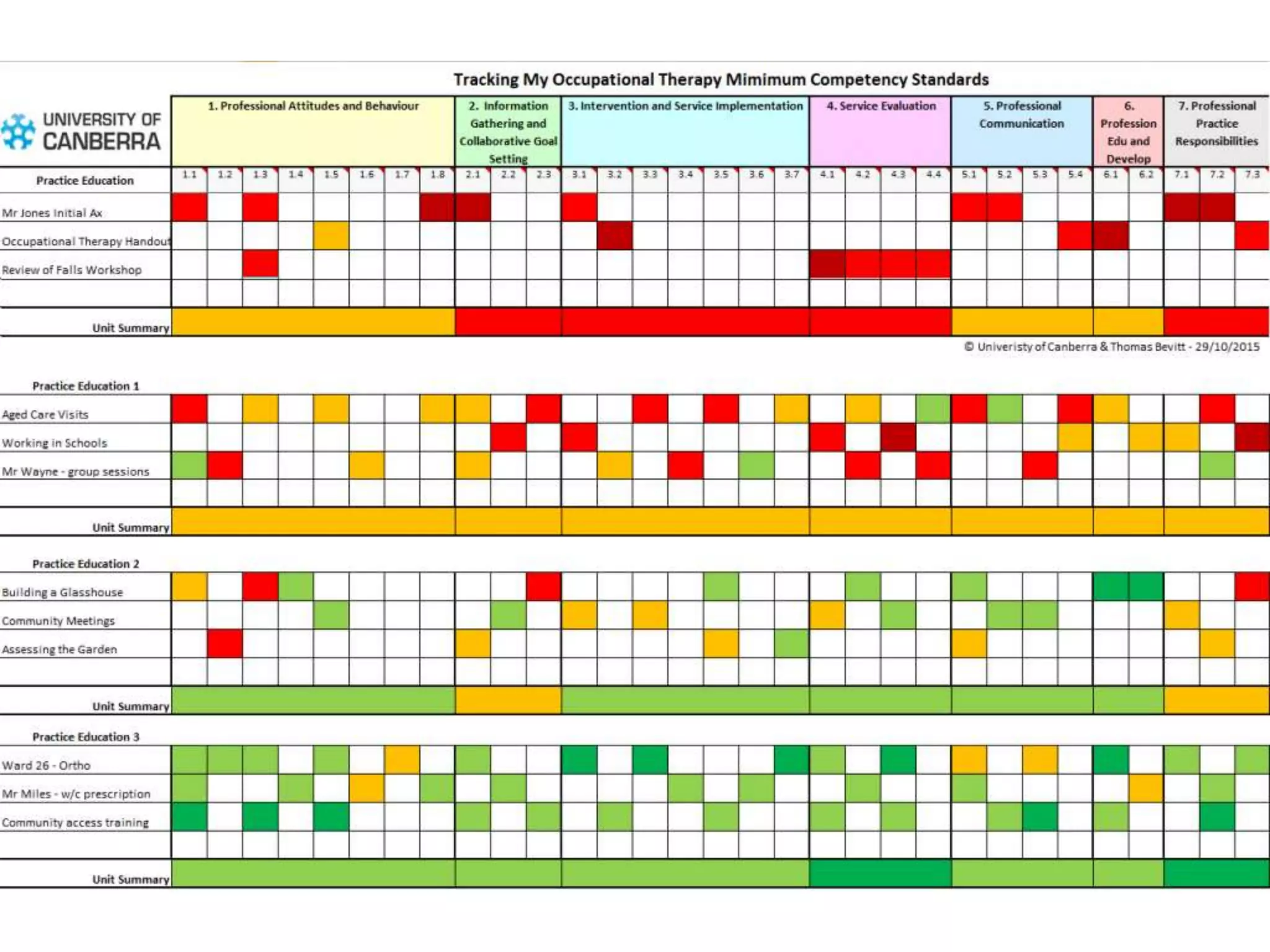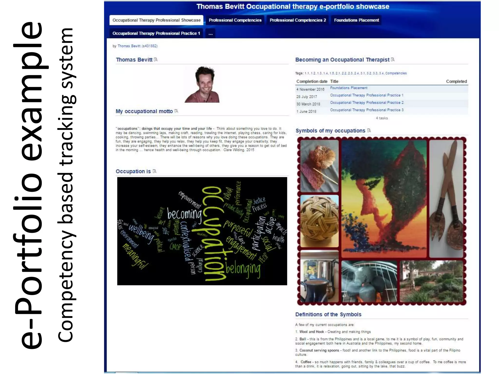 The document provides contact information for Thomas Bevitt, a practice educator coordinator at the University of Canberra. It includes his phone number and email address. Additionally, it references an e-portfolio example and a competency-based tracking system.