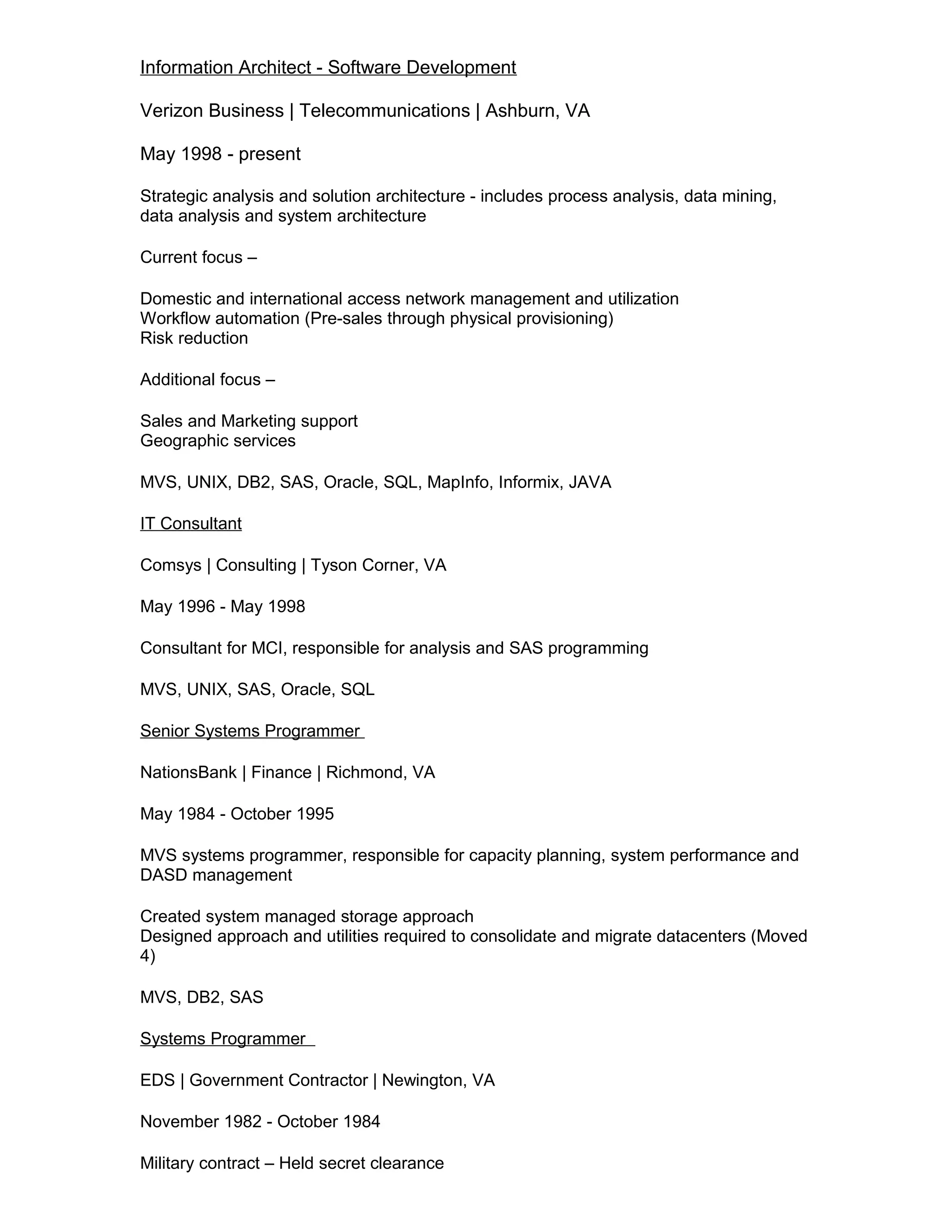 Thomas Clay is an information architect seeking a challenging position that values his technical and analytical skills. He has over 20 years of experience in data analysis, system architecture, business analysis, and application design. His career highlights include being the first to use web technology at MCI and developing approaches to manage business names, select optimal network routes, and automate workflows.