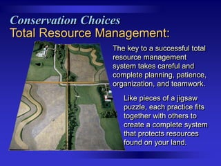 This document provides information on various conservation practices for farms. It discusses total resource management, which involves carefully planning practices that work together to protect land resources. It then summarizes 20 different conservation practices, including planned grazing systems, wildlife habitat management, filter strips, contour farming, and crop rotation. For each practice, it provides a brief description and outlines the benefits in terms of soil erosion, water quality, profits, wildlife habitat, and air quality. The document serves as a guide for farmers to choose conservation practices that fit their objectives and address specific problems on their land.