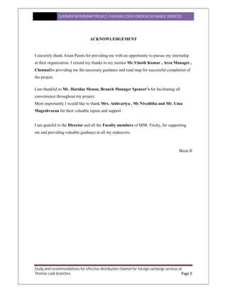 The document is a summer project report that studied Thomas Cook's existing foreign exchange distribution model and made recommendations. It conducted research on educational consultants, shopkeepers at Spencer's Plaza Mall branch, and online consumers. It found that trust and security are strongly correlated with cost and availability for choosing a forex provider. While the online store has potential, awareness is still low and people prefer visiting stores. Promotional activities were done targeting niche segments like educational consultants and Spencer's shopkeepers to increase footfalls at the struggling Spencer's branch. Recommendations included focusing on trust and omnipresence and addressing threats of the online store like delivery delays.
