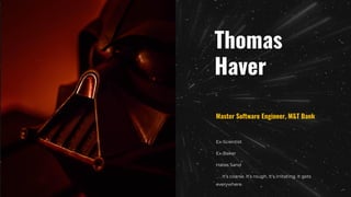 Thomas Haver is an ex-scientist and ex-baker who hates sand. M&T Bank needed a better way to test their mobile banking apps and ensure a good user experience. They lacked centralized testing practices and resources. Perfecto was selected as their primary mobile testing tool to help standardize practices and provide metrics. The manual testing features would help train teams, but automation capabilities were also important for maturity.