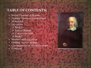 This document provides an overview of Thomas Hobbes' political philosophy as outlined in his work Leviathan. It discusses Hobbes' social contract theory and the emergence of the sovereign authority. Hobbes argues humans surrender their freedoms and form a commonwealth, with the sovereign given absolute power to maintain peace and order. The document also summarizes Hobbes' views on human nature, the different forms of government, and criticisms of his philosophy.