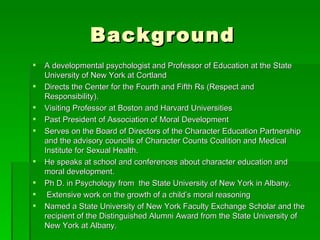 Thomas Lickona is a developmental psychologist and professor who directs the Center for the Fourth and Fifth Rs, focusing on character education. He has a PhD in psychology and has written extensively on child moral development based on the work of Kohlberg and others. Lickona proposes that moral reasoning develops through stages from preschool through adulthood. Some criticize character education for lacking substantive values or improving test scores, but Lickona argues schools should develop intrinsic motivation and moral leadership in students and community.
