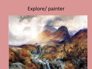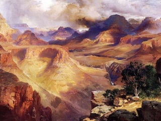 Thomas Moran was a 19th century American landscape painter known for his romantic and dramatic depictions of the American West in the style of the Hudson River School. He would travel out west to make on-site sketches which he would later use to create large-scale landscape paintings back East. His sketches helped inspire the creation of national parks like Yellowstone and the Grand Canyon by showing their natural beauty.