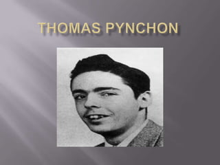 Thomas Pynchon is an American novelist born in 1937 on Long Island, New York. He attended Cornell University where he studied engineering and later English. Some of his notable works include V (1963), The Crying of Lot 49 (1966), and Gravity's Rainbow (1973). His short story Entropy (1960) follows the character Meatball Mulligan who hosts a chaotic party attended by various guests who share their problems as the night descends into further disorder, culminating with a visit from the U.S. Navy who believe it is a brothel. Pynchon is known for his complex, dense writing style that uses parody and absurd plots.