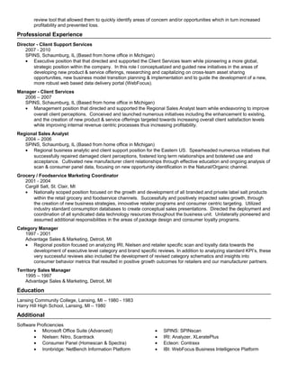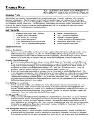 Thomas Rice is an accomplished business development professional with over 25 years of experience in the consumer packaged goods industry. He has extensive experience in business development, category and brand management, team building, client support, and sales management. Some of his accomplishments include conceiving an innovative supplemental insights offering that generated new profitable consulting contracts, developing growth strategies that increased sales by 40% for brands, and transitioning a company from data analytics to a new profitable consulting model.