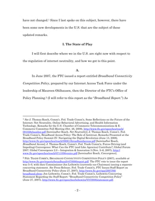 Commissioner J. Thomas Rosch discusses the Federal Trade Commission's (FTC) position on Internet neutrality, emphasizing the agency's cautious approach in regulating broadband services due to potential unforeseen consequences. The FTC has historically maintained that it has jurisdiction over broadband services classified as 'information services,' while the FCC has been more proactive in establishing Internet neutrality rules. Recent developments include the FCC's adoption of an 'Open Internet Order' that outlines principles promoting a free and open Internet, despite dissent from some commissioners regarding the necessity of such regulations.