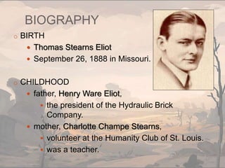 1. T.S. Eliot was an American-born British poet, playwright, and literary critic born in 1888 in Missouri. He is known for works like The Waste Land and Four Quartets.