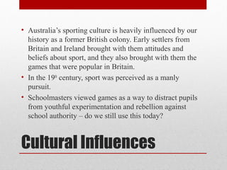 Australia's sporting culture was heavily influenced by early British settlers who brought their popular games and beliefs about sport being a manly pursuit.