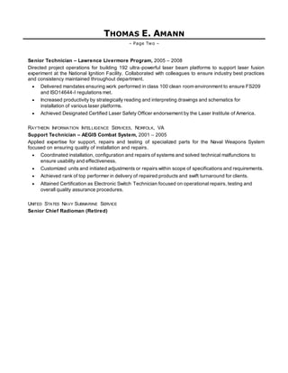 This resume is for Thomas E. Amann, who has over 15 years of experience supporting and maintaining electronic systems. He has expertise in repairing military electronics for both military and civilian applications. Currently he is a Production Supervisor at Raytheon, where he oversees operational processes for repairing computer equipment used at airport towers. Previously he was a Senior Technician at Raytheon, where he directed projects to build laser platforms and support repair of naval weapons systems. He has extensive training and certifications in electronics maintenance.