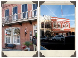 The document highlights a charming plantation town known for its unique gourmet items and 1882 relics. It features local spots like a cozy brew cafe and a book nook filled with treasures. Additionally, it mentions a visitor center located on Broad Street near a notable oak tree.
