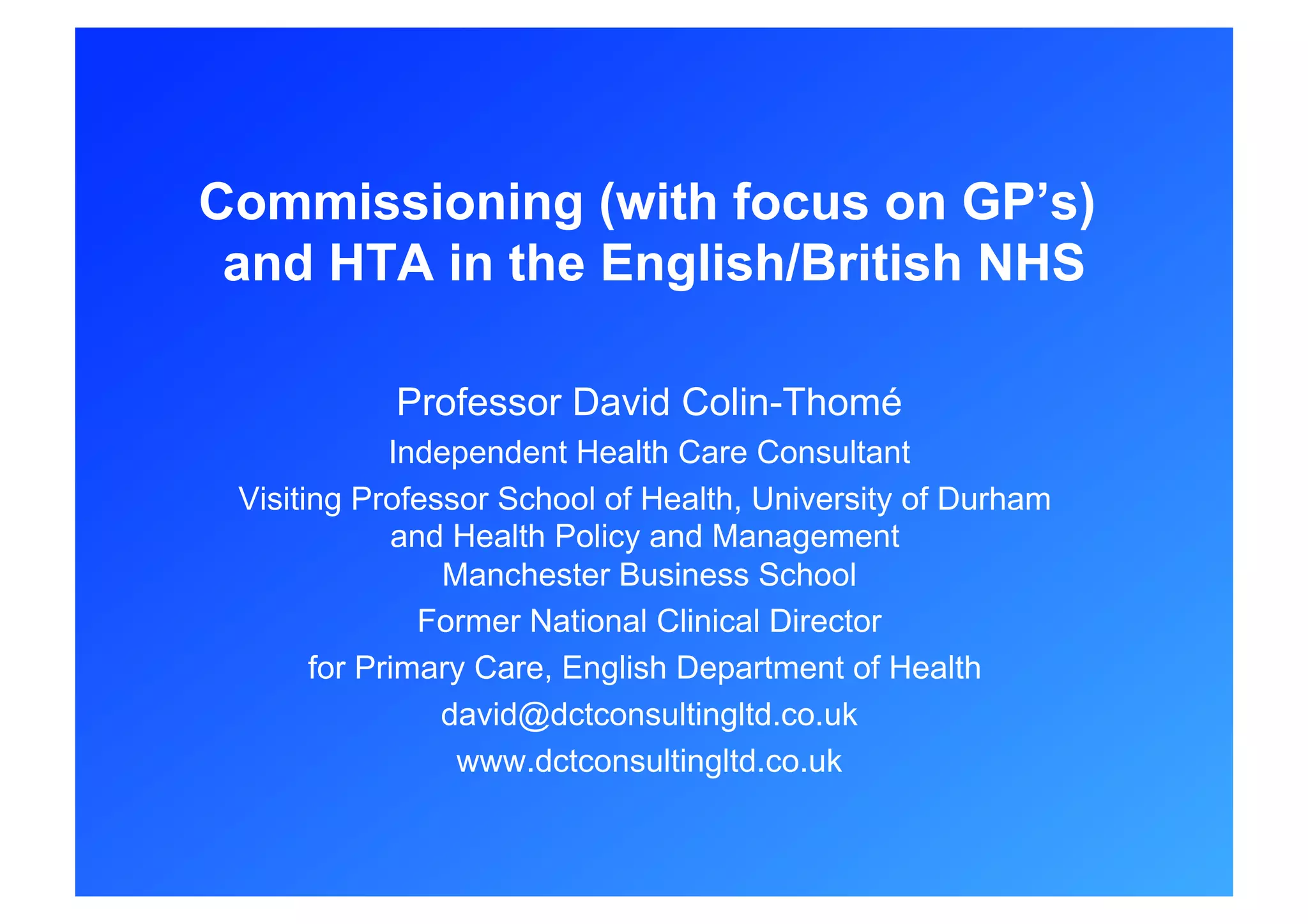 This document discusses health technology assessment (HTA) and commissioning in the English NHS, with a focus on general practitioners (GPs). It provides background on HTA, which evaluates the clinical effectiveness and cost-effectiveness of health interventions. It also discusses key elements of the 2010 NHS reform plan and the history of GP commissioning in England since the 1990s, including GP fundholding schemes that gave GPs budgets to purchase some services. Evaluation found GPs were able to improve primary care and develop alternatives to hospital care, but faced challenges shifting resources from hospitals.