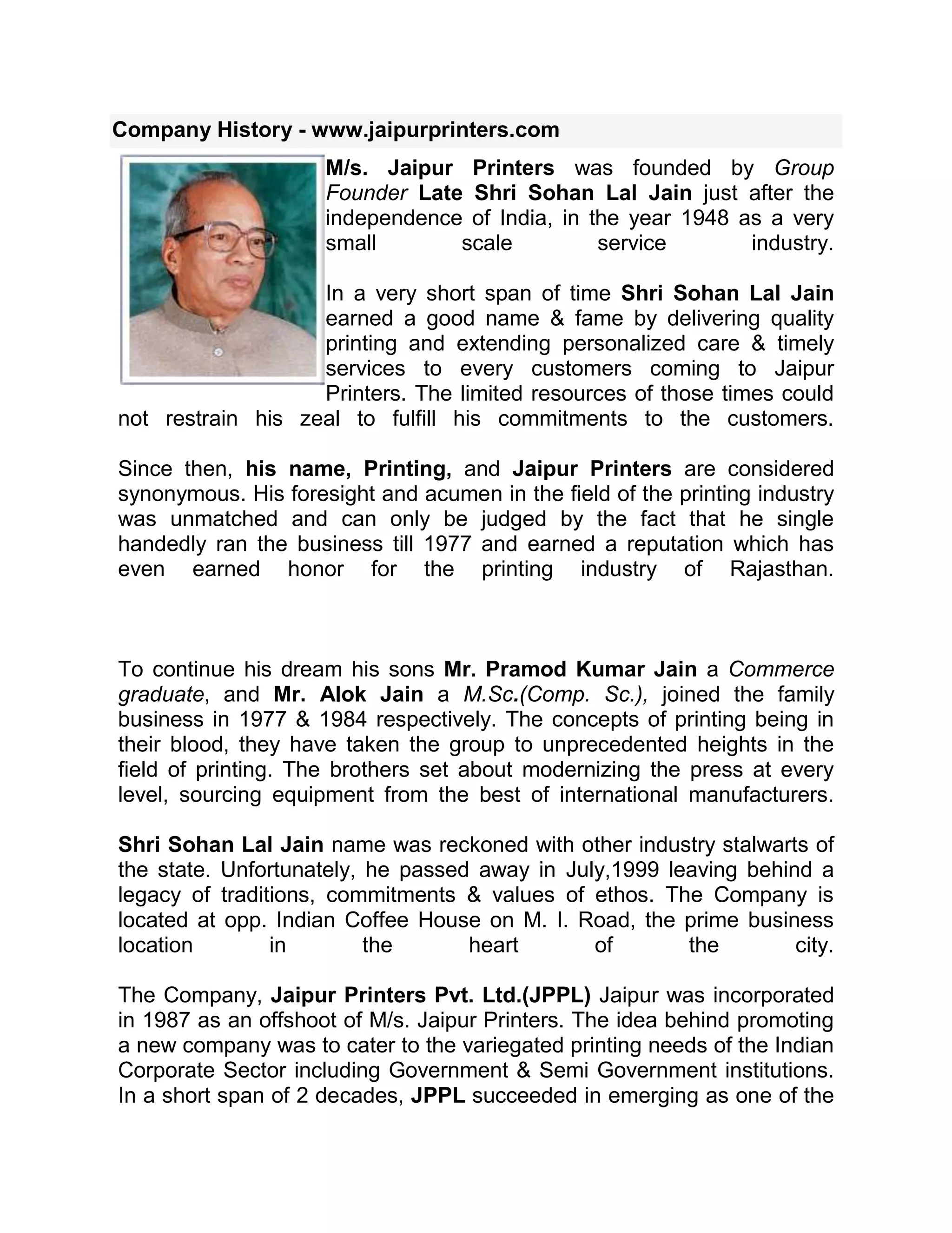- Jaipur Printers was founded in 1948 in Jaipur, India and has since grown to become a leading printing company through focus on quality and customer service.