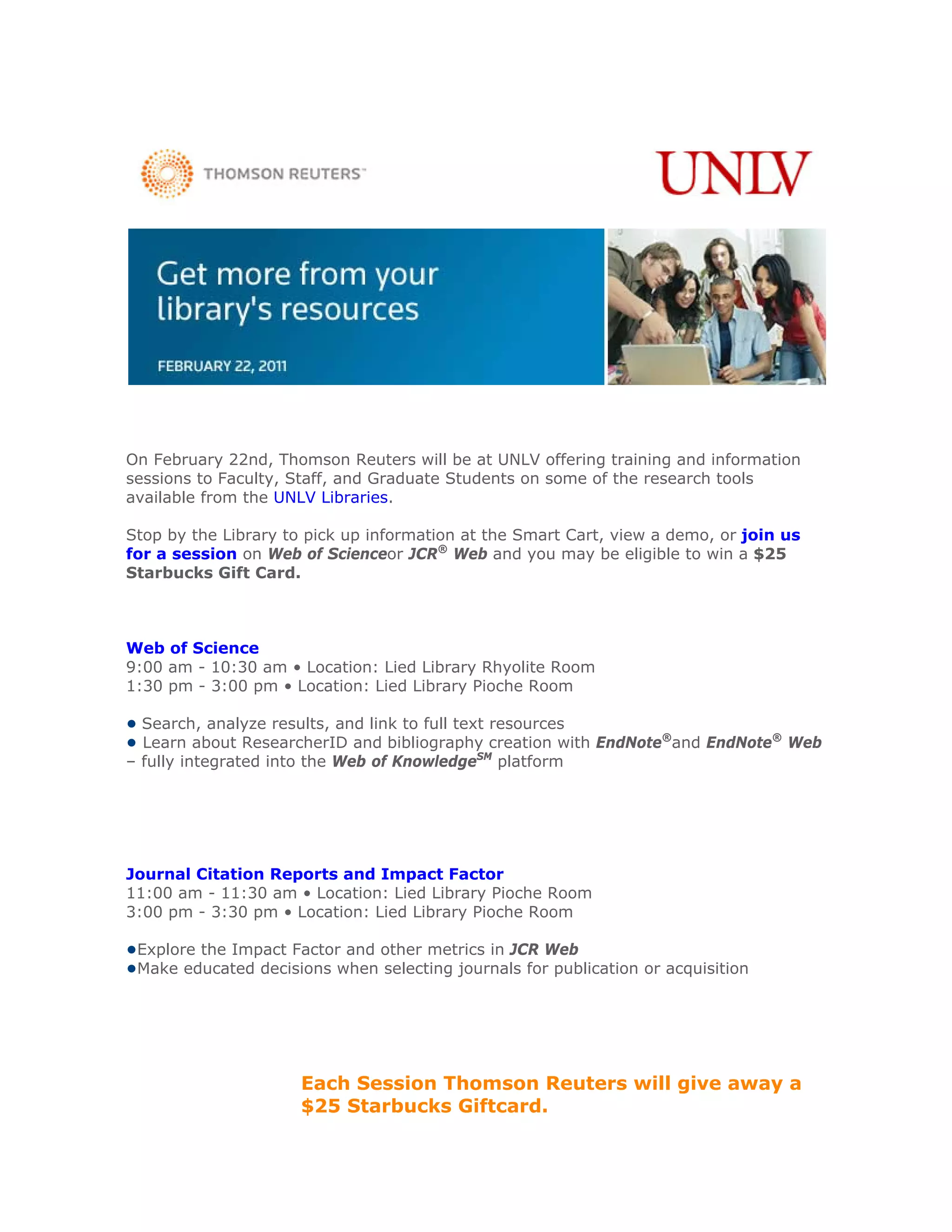 On February 22nd, Thomson Reuters will be hosting information sessions and demonstrations of their research tools at UNLV for faculty, staff, and graduate students. Sessions will cover Web of Science and Journal Citation Reports, and will provide overviews of searching databases, bibliographic management, and impact factors. Participants can enter to win a $25 Starbucks gift card by attending a session or visiting the information booth in the library.