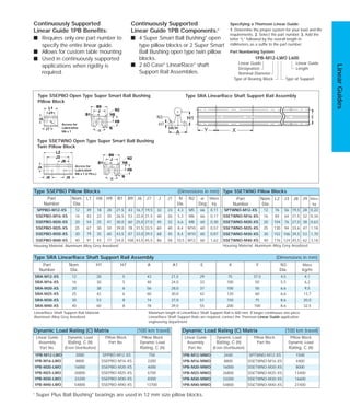 The document contains specifications for various continuously supported linear guide assemblies and their components. It lists part numbers, dimensions, load ratings, and other technical specifications for linear guides, support rails, pillow blocks, and bearings. Materials include aluminum alloys and bearings include ball bushings. Linear guides are specified by part number plus length and provide continuous support for applications requiring rigidity.