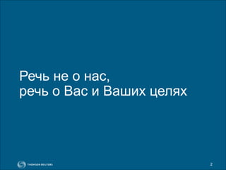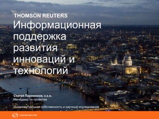 Документ описывает услуги компании Thomson Reuters в области интеллектуальной собственности и научных исследований, акцентируя внимание на поддержке инноваций и предоставлении надежных данных для анализа патентов. Компания предлагает уникальные инструменты для управления патентами и аналитические услуги, включая аудит портфолио и исследование технологий. В документе также приводится информация о патентных индексах и ресурсах, доступных для поиска и анализа патентов по всему миру.