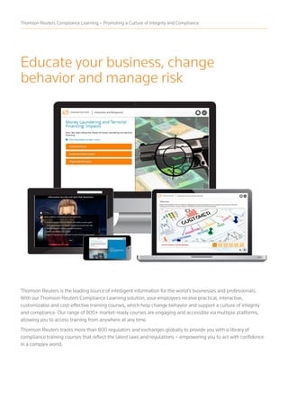 Thomson Reuters Compliance Learning provides over 800 customizable training courses designed to promote integrity and compliance within organizations. These courses cover critical compliance topics globally and are supported in multiple languages, utilizing interactive and engaging formats such as videos and gamification to enhance learning. The platform also includes a flexible management tool for tracking and reporting compliance training, ensuring organizations can meet regulatory requirements effectively.
