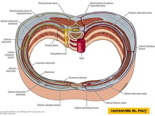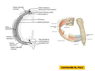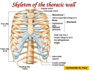 1. The document describes the anatomy of the thoracic wall including bones, joints, muscles, blood vessels, and nerves.