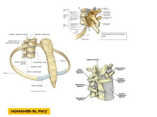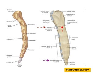 2. It discusses the 12 pairs of ribs, their classification as true, false, or floating ribs, and their articulations with the sternum.