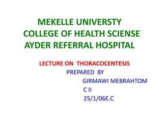This document provides an overview of thoracentesis, including: