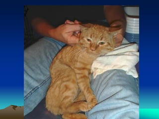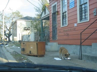 Hurricane Katrina left hundreds of thousands of animals dead or without homes in New Orleans. While some were reunited or adopted, many animals were still waiting to be found or had formed feral dog packs. The document outlines legislation aimed at requiring disaster plans to include pets and calls on readers to support organizations helping animals displaced by the hurricane through donations, fostering, or volunteering. It describes the destruction left behind in New Orleans in the aftermath of the storm.