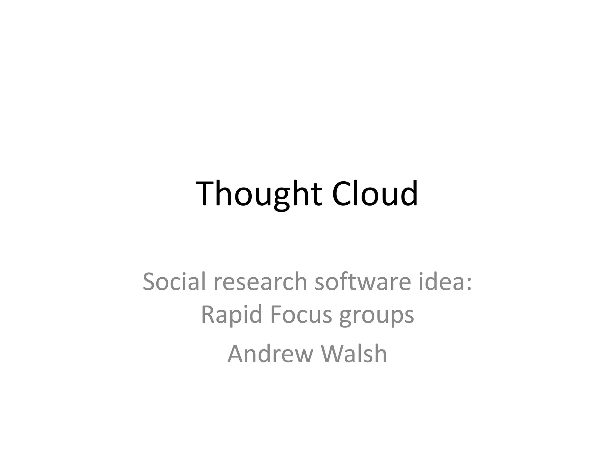 This document proposes a new approach to conducting rapid focus groups using mobile devices and cloud-based software. The approach involves participants providing initial ideas in response to a question, which are displayed as bubbles. Participants can then vote on the most important ideas, merge similar ideas, and add comments. The software would consolidate the ideas and allow the most popular ones to be examined in more depth. It aims to generate a report quickly based on the inputted information and discussion. This new approach aims to make focus groups more efficient while capturing qualitative data for analysis and reporting.
