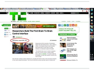 This document discusses emerging technologies in thought control and brain-computer interfaces. It begins by noting how imagination and accomplishment are becoming closely aligned due to advances in technology. Examples are then given of existing thought-controlled wheelchairs and a robotic arm that allows a paralyzed woman to feed herself. The document outlines challenges in developing more advanced brain-computer interfaces, such as creating smaller and more sensitive hardware to communicate with the brain and software to accurately decode electrical signals. Finally, the document speculates that in 50 years human minds may be as connected as computers are today through the internet, but raises ethical questions about thought control of other individuals.