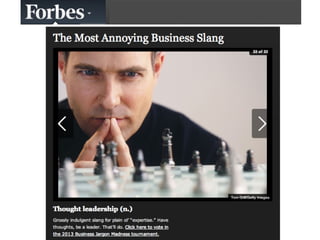 The document discusses thought leadership in loyalty marketing, emphasizing the need for a structured approach to improve communication and engagement. It highlights the importance of understanding both the target audience and the brand's unique perspective to create effective content strategies. Key concepts include the long-term value of thought leadership and the significance of commitment from leadership to foster an organizational culture that supports it.