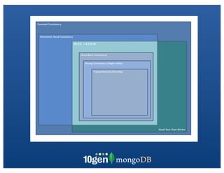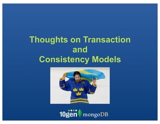 The document discusses database transaction models and consistency in light of CAP theorem. It explains that RDBMS use ACID transactions while newer databases like NoSQL choose availability over consistency. Eventual consistency guarantees last write wins if no new updates. It discusses strategies for handling multiple writers like last write wins with vector clocks. MongoDB supports atomic operations on single documents and provides options for read and write scaling through replication and sharding.