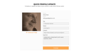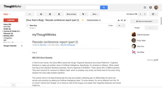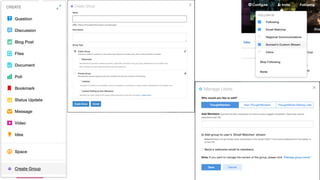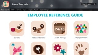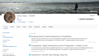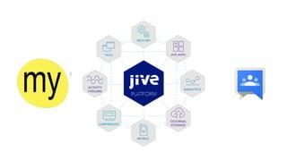The document discusses the decentralized and globally distributed structure of a technology company focused on collaboration and communication through digital tools like Jive. It highlights the importance of email as a primary communication tool, while also emphasizing the need for integration with other platforms to enhance collaboration and connectivity among employees. Strategies are presented on creating visual 'shop fronts', promoting serendipity, and enhancing search functionality to foster community engagement and effective information sharing.