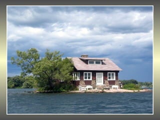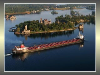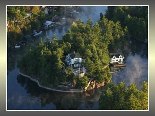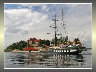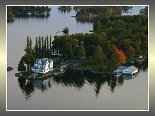 The Thousand Islands are a chain of over 1,865 islands that straddle the US-Canada border in the Saint Lawrence River between Ontario and New York. The islands range significantly in size, from large islands of over 100 square kilometers to small, uninhabited rock outcroppings that are homes to migratory waterfowl. The area is a popular tourist destination for vacationers, campers and boaters due to its fresh water recreational activities.