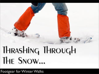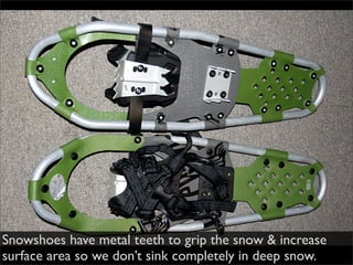 Snowshoes have metal teeth to grip snow and increase surface area to prevent sinking completely in deep snow. Yaktrax have metal coils that provide traction on ice. Yaktrax attach to shoes to provide traction on snow and ice.