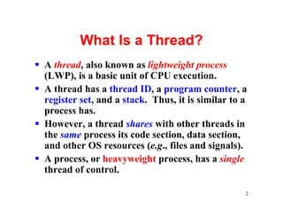 1) A thread is a basic unit of CPU execution that shares code, data, and resources with other threads in the same process. It has its own program counter, register set, and stack.