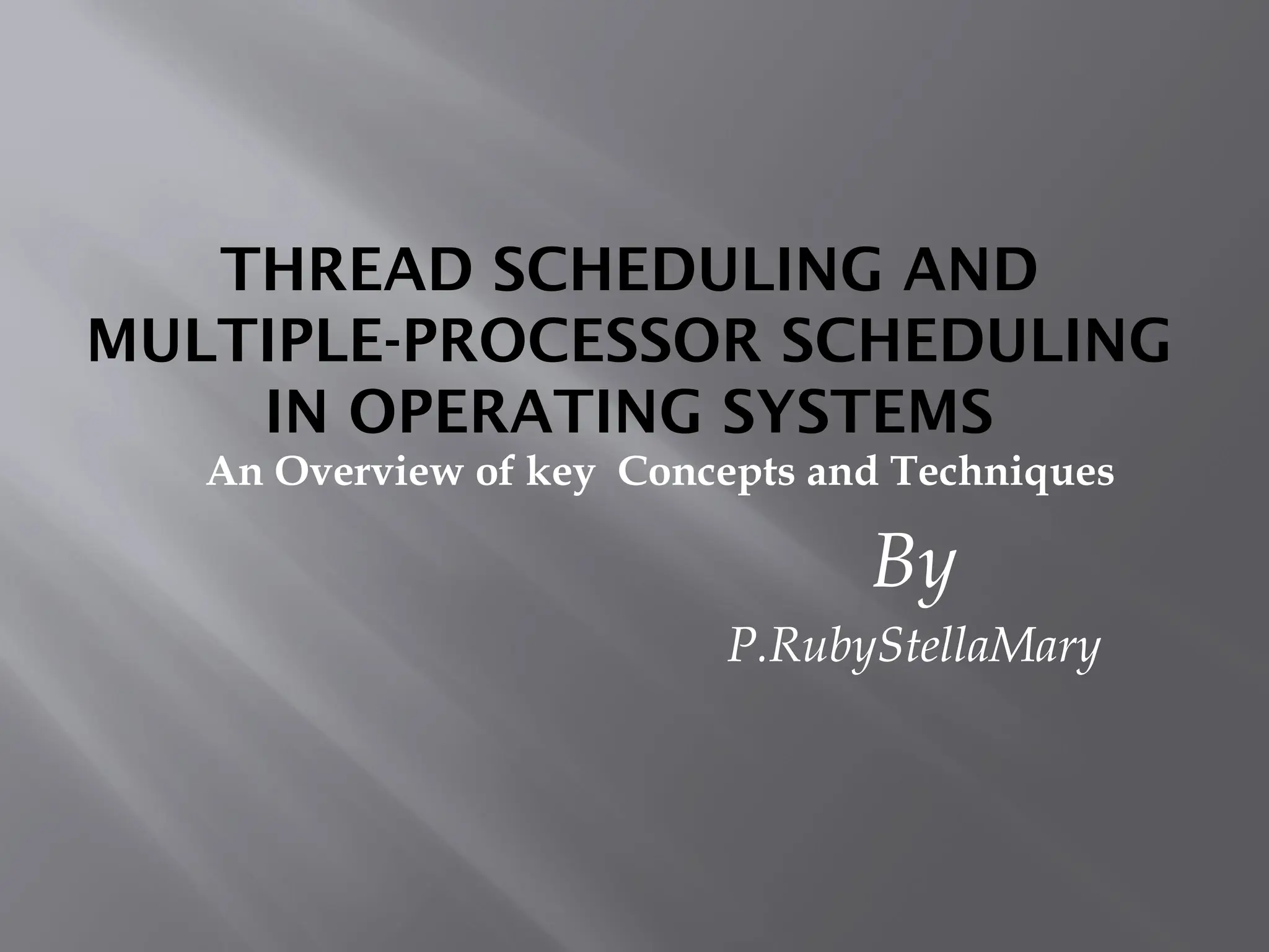 The document provides an overview of thread and multiple-processor scheduling in operating systems, covering key concepts such as thread definitions, scheduling models, and common algorithms. It discusses different types of multiprocessing systems and their scheduling methods, including load balancing techniques and processor affinity. Additionally, the document addresses challenges in scheduling and future trends in multi-core processing and energy-aware scheduling.
