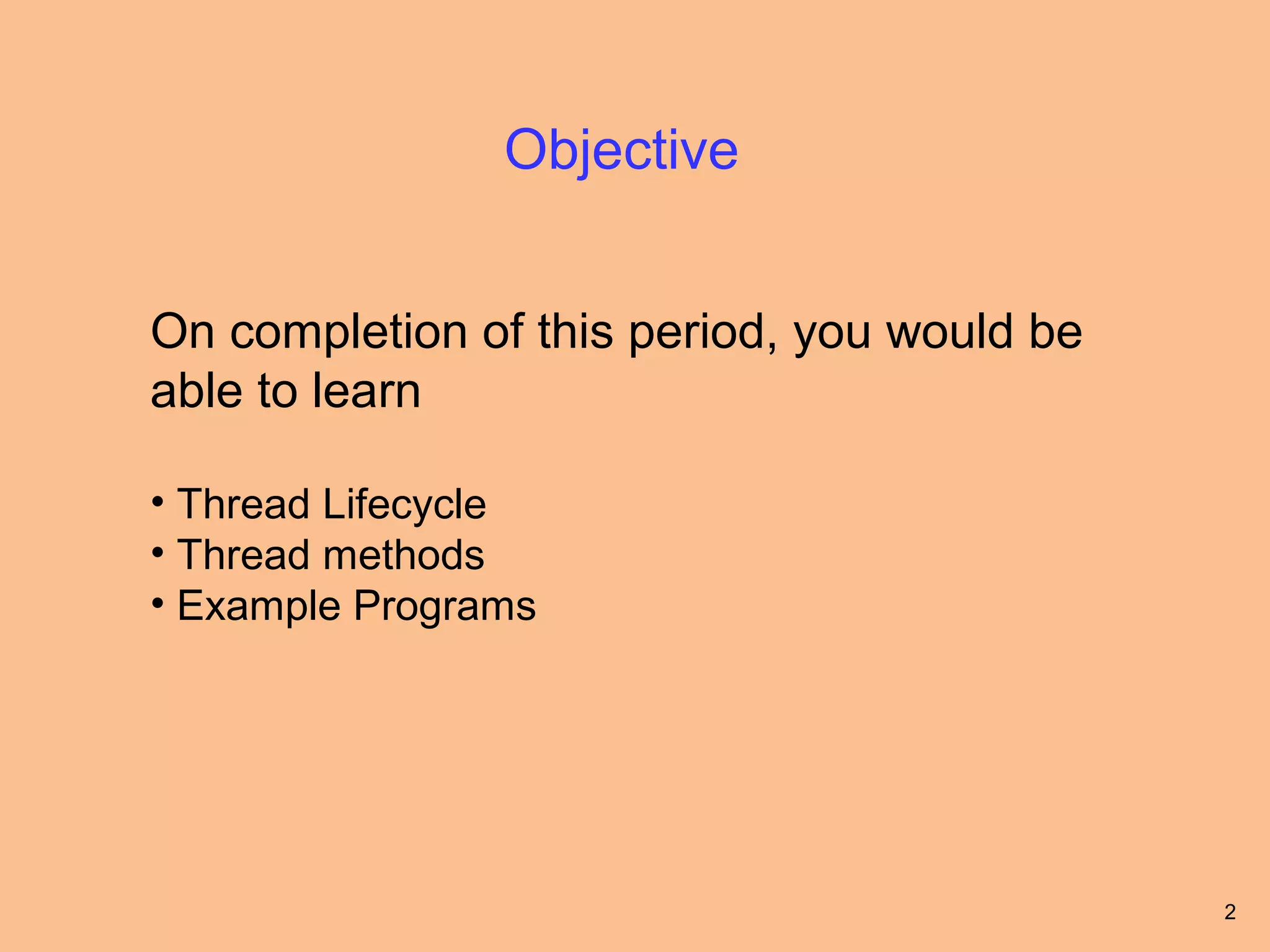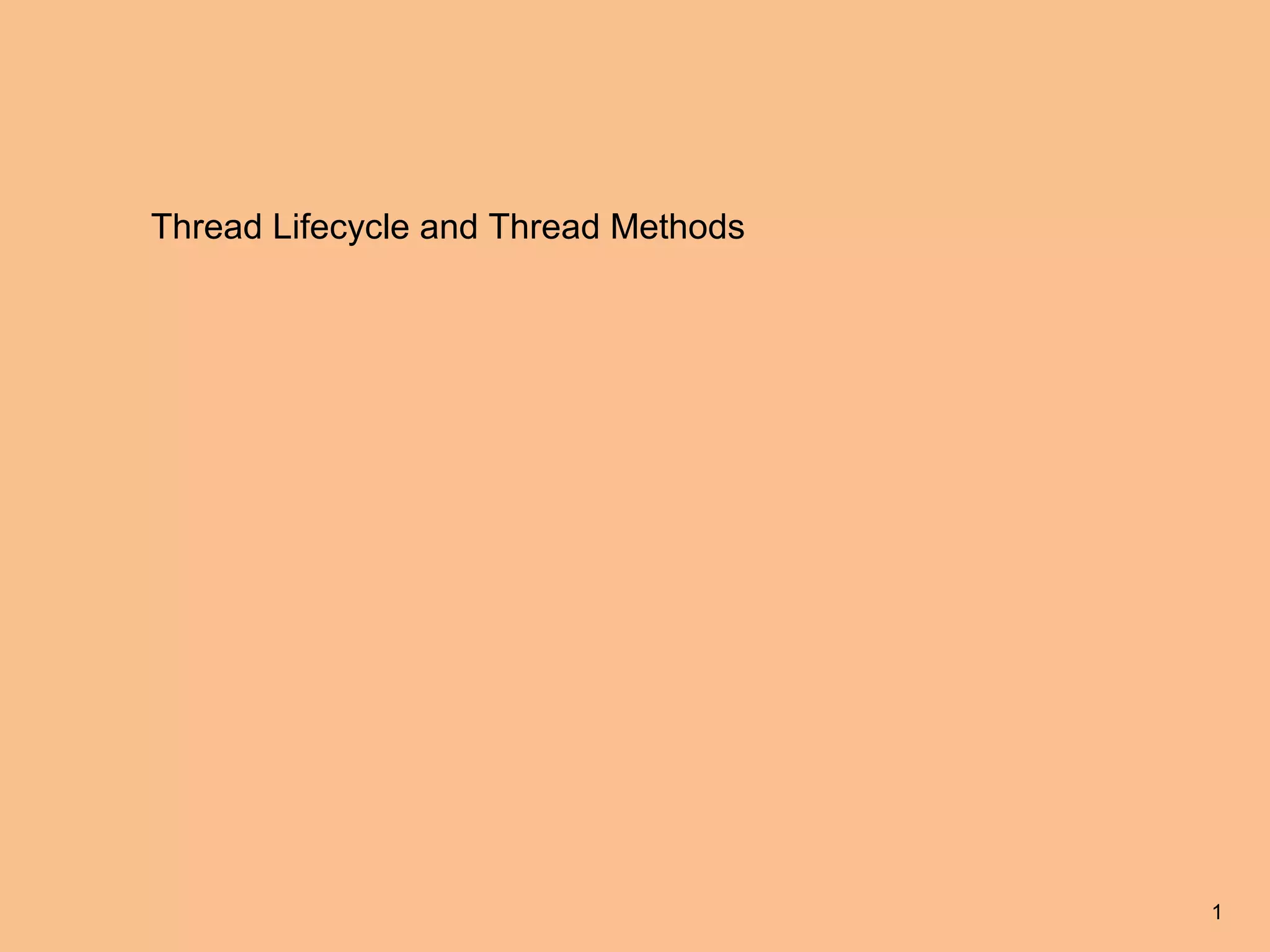 The document discusses thread lifecycle and methods in Java. It explains that a thread goes through different states like new, ready, running, blocked, and dead. It provides a state transition diagram and describes each state. It also discusses various thread methods like start(), stop(), suspend(), resume(), wait(), notify(), isAlive(), and join(). Example programs are provided to demonstrate using these methods and the thread lifecycle.