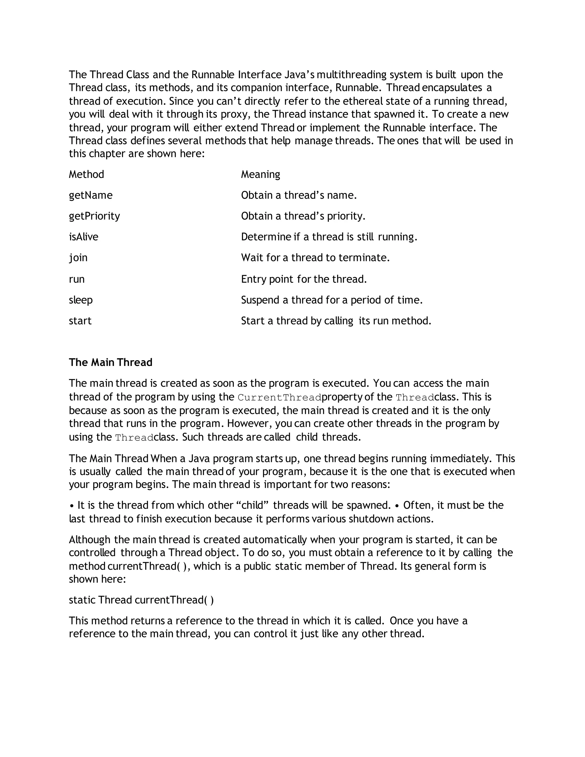 Thread is the basic unit of CPU utilization in an operating system. A single-threaded process can only perform one task at a time, while a multithreaded process can perform multiple tasks simultaneously using threads. Java uses the Thread class and Runnable interface to create and manage threads. The main thread is created automatically, while additional threads can be instantiated by implementing Runnable or extending Thread. Synchronization is needed when threads share resources to prevent race conditions.