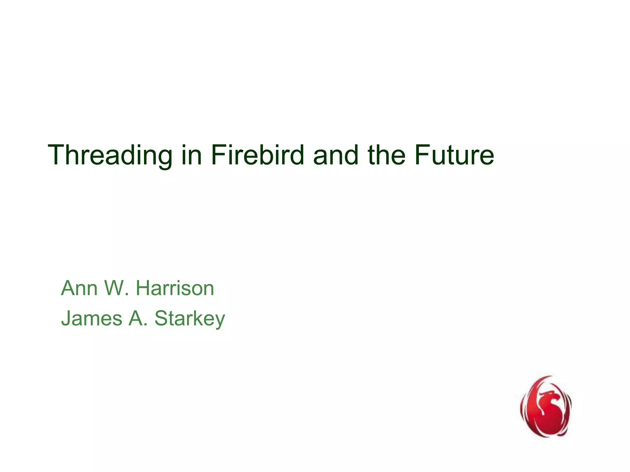 This document discusses the history and future of threading in Firebird databases. It describes how early versions of Firebird were not multi-threaded, but modern versions use threading to improve performance on multi-processor systems. Key aspects of Firebird threading include using limited worker threads to balance load across CPU cores without excessive contention, and fine-grained locking of individual data structures for maximum parallelism.