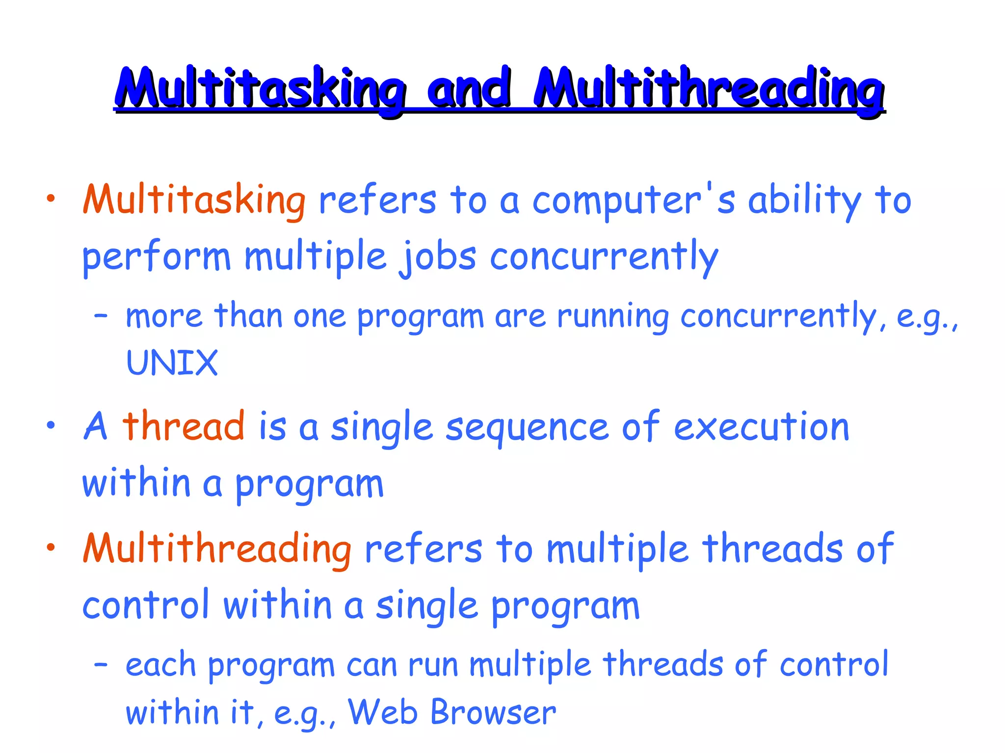 Threads allow programs to perform multiple tasks concurrently. A thread is a single sequence of execution within a program. Multithreading refers to multiple threads running within a single program. Threads share program resources but have their own call stack and local variables. Threads are created by extending the Thread class or implementing the Runnable interface. Synchronization is needed when multiple threads access shared resources concurrently to prevent race conditions. The wait() and notify() methods enable threads to cooperate by pausing and resuming execution.