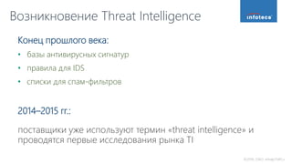 Документ обсуждает концепцию threat intelligence (TI), подчеркивая ее значение в сборе, анализе и обмене данными об угрозах. Он выделяет различные типы TI, процессы ее использования, а также источники данных и форматы, используемые для обмена информацией. Основные потребители TI охватывают стратегический и операционный уровни управления, а данные TI помогают в обнаружении, реагировании и планировании на киберугрозы.