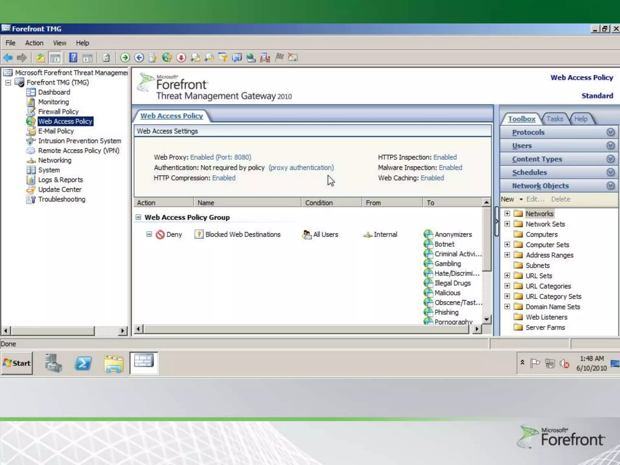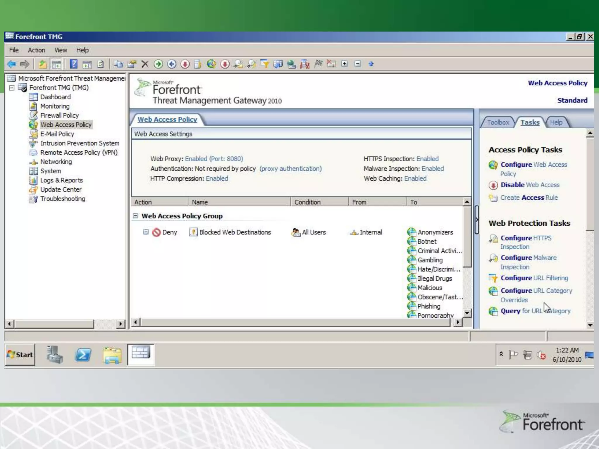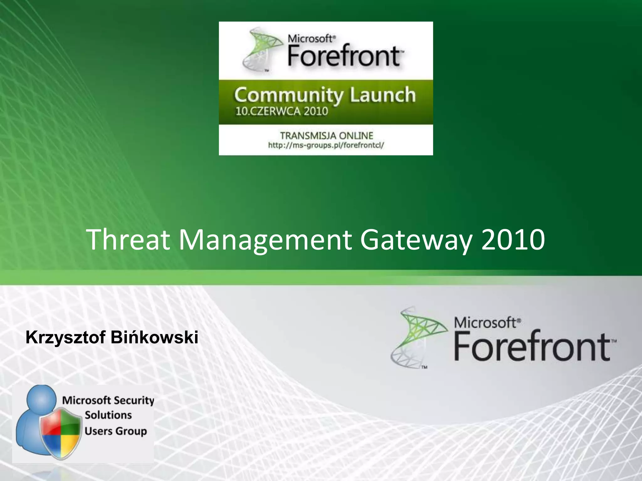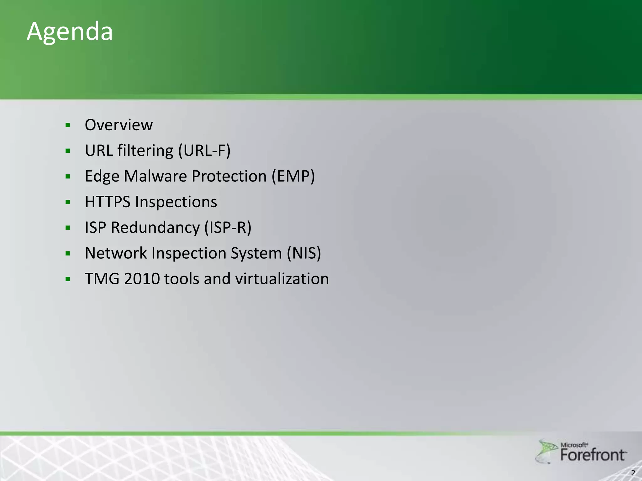 This document provides an overview and agenda for Threat Management Gateway 2010. It discusses several key features including URL filtering, Edge Malware Protection, HTTPS inspections, and the Network Inspection System. The document is intended to outline how these features can enhance network security and protection. It provides high-level information on configuration and usage of the different Threat Management Gateway 2010 components.