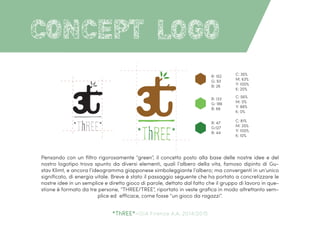 Il documento esplora il concetto di sostenibilità attraverso il simbolismo dell'albero della vita e di altre rappresentazioni, evidenziando l'energia vitale come tema centrale. Il nome del gruppo, 'three/tree', riflette la composizione del team e il concetto di semplicità. Viene anche menzionato il background professionale dei membri del gruppo, enfatizzando competenze in design grafico e utilizzo di vari software per la creazione.