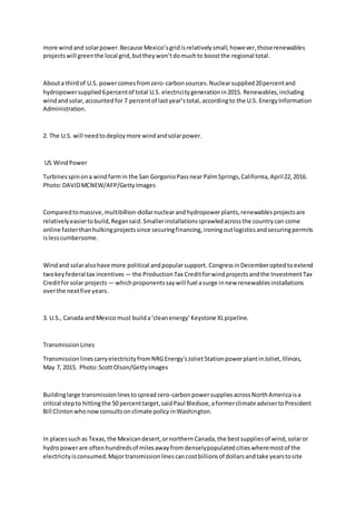 The leaders of the US, Canada, and Mexico pledged to generate half of North America's electricity from zero-carbon sources within 10 years. To achieve this, they will need to invest billions in new wind, solar, hydroelectric, and nuclear projects, adopt incentives, and promote regional energy trade. Experts say the largest burden will fall to the US due to its much larger energy market compared to Mexico and Canada. Major transmission lines will also be needed to connect areas with renewable energy supplies to population centers.