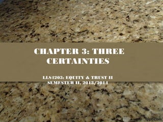 The document discusses the three certainties required to create a valid private express trust: (1) intention, (2) subject matter, and (3) object. It provides details on each certainty, including examples from case law. For certainty of intention, the words used must show the settlor's clear intention to create a trust. For certainty of subject matter, the trust property must be clearly defined or ascertainable. For certainty of object, the beneficiaries must be human and ascertainable as individuals or as members of a defined class.