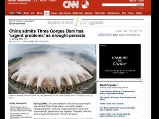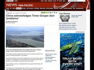 The document discusses the Three Gorges Dam, a groundbreaking man made structure on the Yangtze River in China that has faced criticism for its potential faults and impacts on those affected. It compares media coverage of the dam and discusses possible solutions.