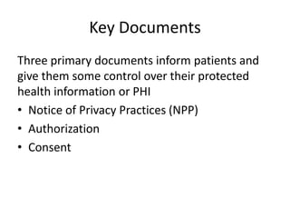 This document discusses three key documents related to patient privacy under HIPAA: the Notice of Privacy Practices (NPP), Authorization, and Consent. The NPP explains how a provider will use and protect a patient's health information and their privacy rights. An Authorization is required to release health information outside of treatment, payment, and operations and must contain specific elements. A Consent allows treatment but does not authorize releasing records. Providers must ensure proper privacy practices using these forms to protect patient information.