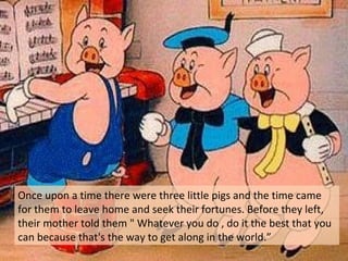 The Three Little Pigs tells the story of three little pigs who build houses of different materials and encounter the Big Bad Wolf. The first pig builds his house of straw, which the wolf easily blows down and eats the pig. The second pig's house of sticks also gets blown down by the wolf. The third pig's house of bricks stands strong against the wolf's blows, but the wolf tries to enter down the chimney and falls into a pot of boiling water instead, ending the threat. The story teaches that doing things well is the way to succeed.
